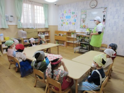 給食の先生のお話を聞いて、野菜ちぎりスタート!