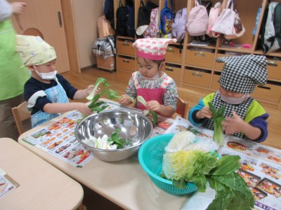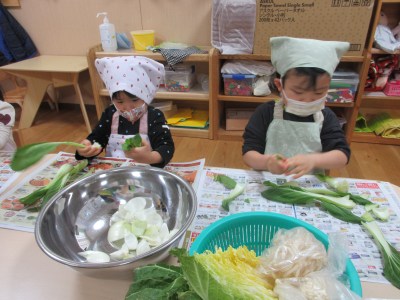 白菜やチンゲンサイを1枚ずつはがしてちぎったり、えのきを丁寧に1本ずつに割いたりと、とっても集中して野菜ちぎりを楽しんでいました。