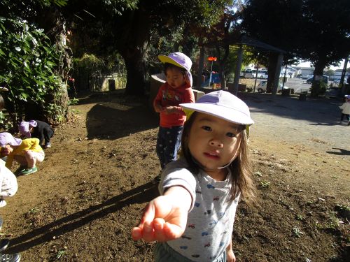 公園に着くとどんぐりや落ち葉を見つけ、「これはもみじで、これはどんぐり!」と保育者に嬉しそうに見せてくれました。
