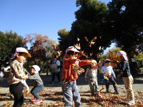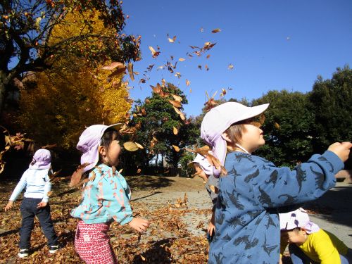 落ち葉をたくさん集めて上に投げ、シャワーのようにヒラヒラと降ってくるのを楽しんでいる姿も見られました。