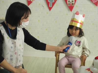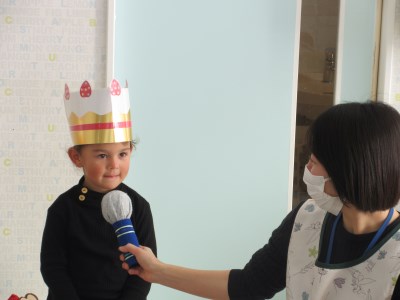 12月は、きりん組さんとうさぎ組のお友だち2名が主役となりました!2人とも前に出るとドキドキ…さっそくインタビューしてみます(^○^)