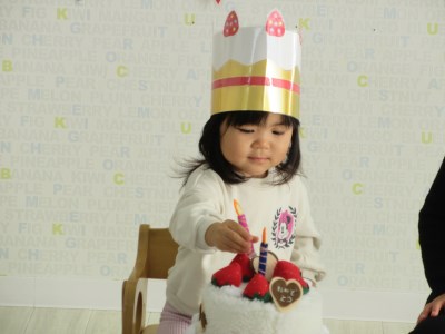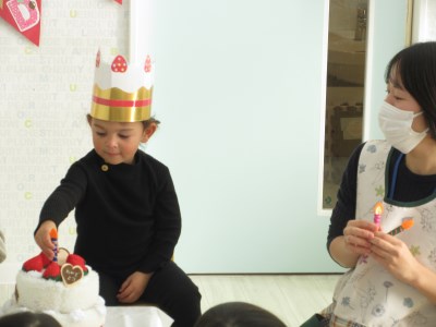 最後は12月生まれのお友だちに一本ずつろうそくを付けてもらって、お誕生日ケーキの完成です(^^)/