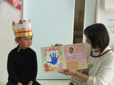 ニッコリ笑顔の写真と、可愛い手形にお誕生児のお友だちもニヤニヤ笑顔がこぼれていましたよ!