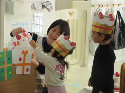 「お誕生児のお友だちのために作ったケーキ…どの箱に入っているっけ?」と始まり、みんなで一つずつプレゼントを開けてみました♪