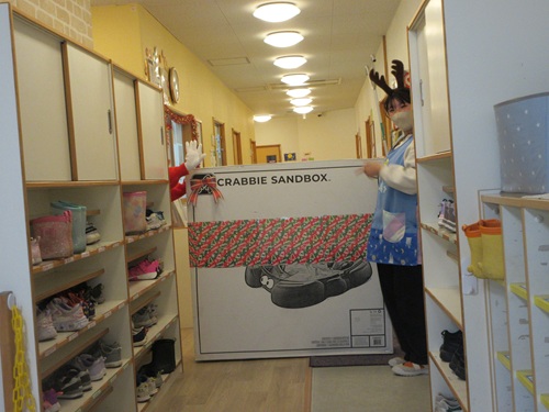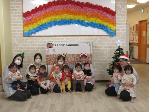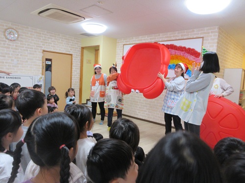 その後幼児クラスでクリスマスのプレゼント運びゲームを行い、プレゼントを落とさないように大事に運んでいました。