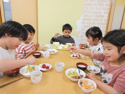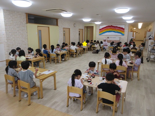 給食はホールで3クラス合同で会食をしました。いつもと違う雰囲気の中で食べるご飯はとても楽しそうでした。