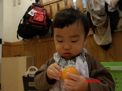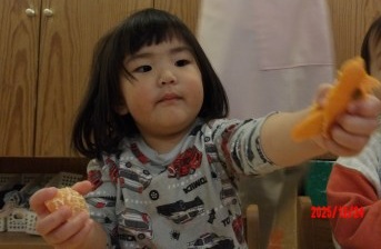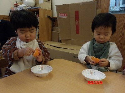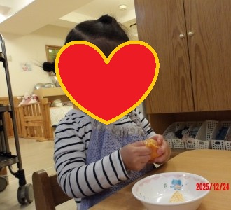 12月の1歳児クラスの食育活動は【みかんの観察・皮むき】でした☆