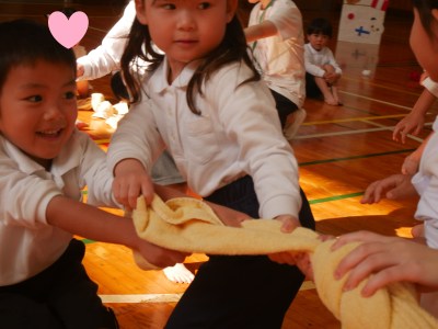 続いての種目は「うさぎ、ぱんだ、きりん組混合 タオル引き」です。