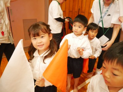 最初の種目はぱんだ組、きりん組 「混合リレー 走れ!ぱんきりレース」です。