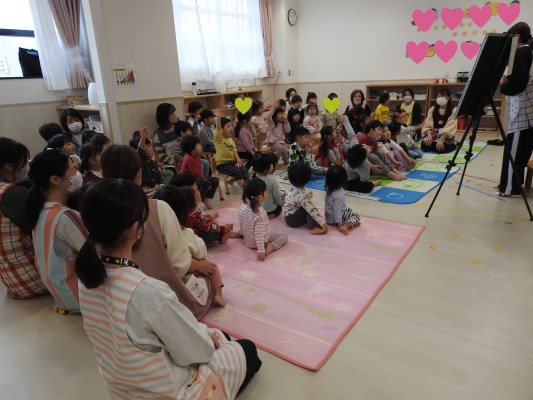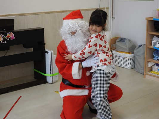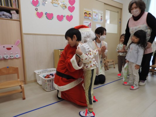 サンタさん登場で、「サンタさん大好き!」「プレゼントありがとう」とみんなハートマーク♡を手で作っていました。