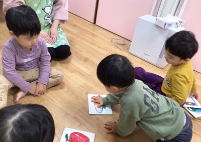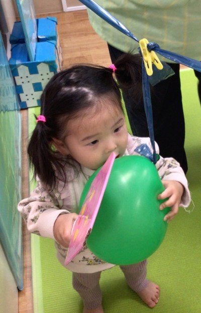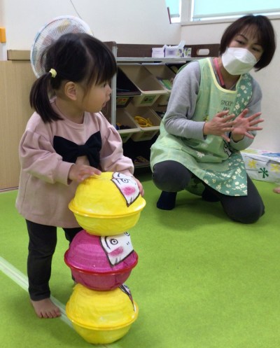 2歳児さんは、カルタ遊び→風船羽根つき→だるま積み