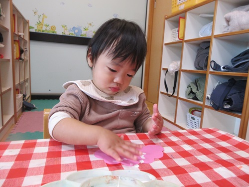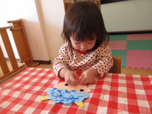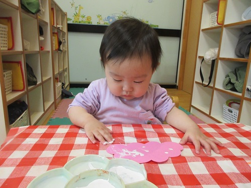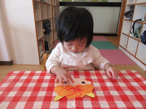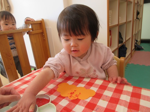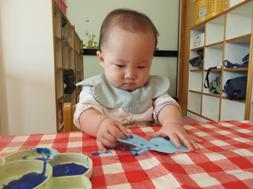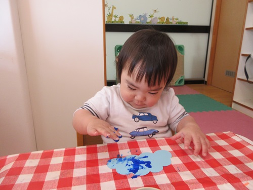 絵の具の感触を不思議に感じながらも、自ら触れてみたりと十分に楽しみながら取り組みました。