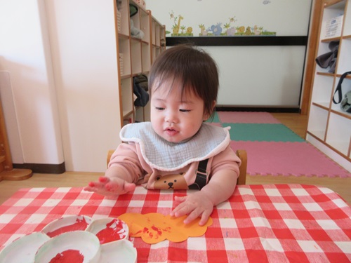 保育者が実際に手本を見せると真似をして、画用紙にペタペタと手で色を付けていました。