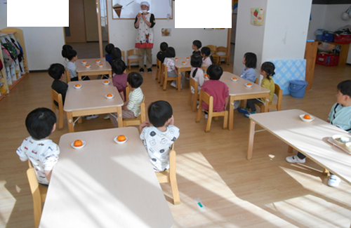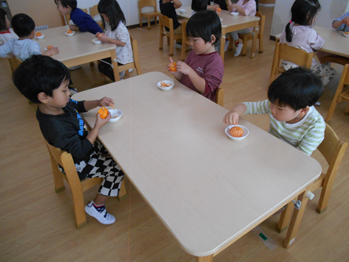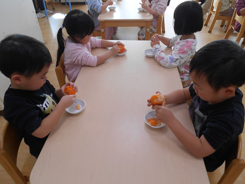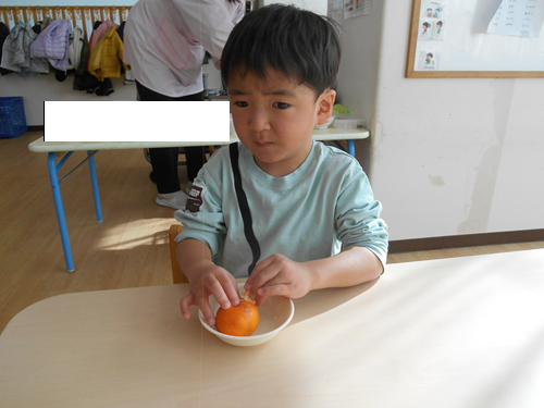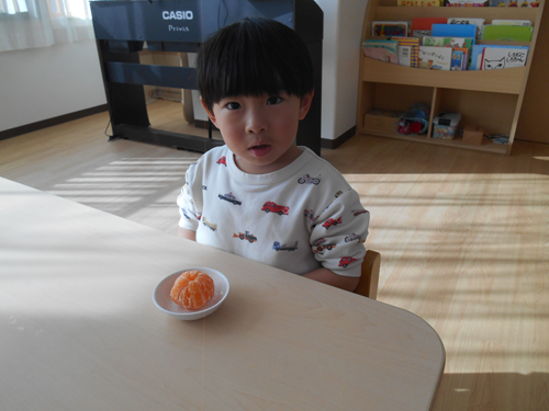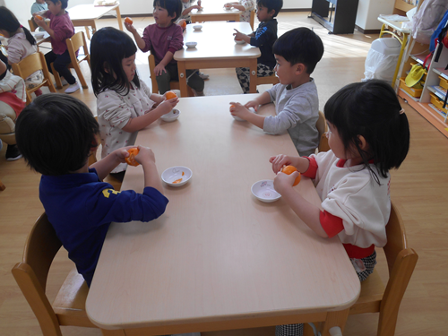 こんにちは。 ミアヘルサ保育園ひびきかしわです。 今日はほし組で「みかんの皮むき」を行いました。 まず、栄養士がみかんの皮むき方について説明をしました。 実際に剝いてみます。 自分で剥くことが出来ました! ご家庭でも今日の様子を聞いてみて下さいね。