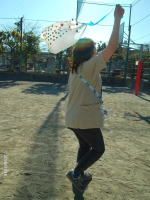 出来上がった凧を持って公園のグラウンドで凧揚げ大会!