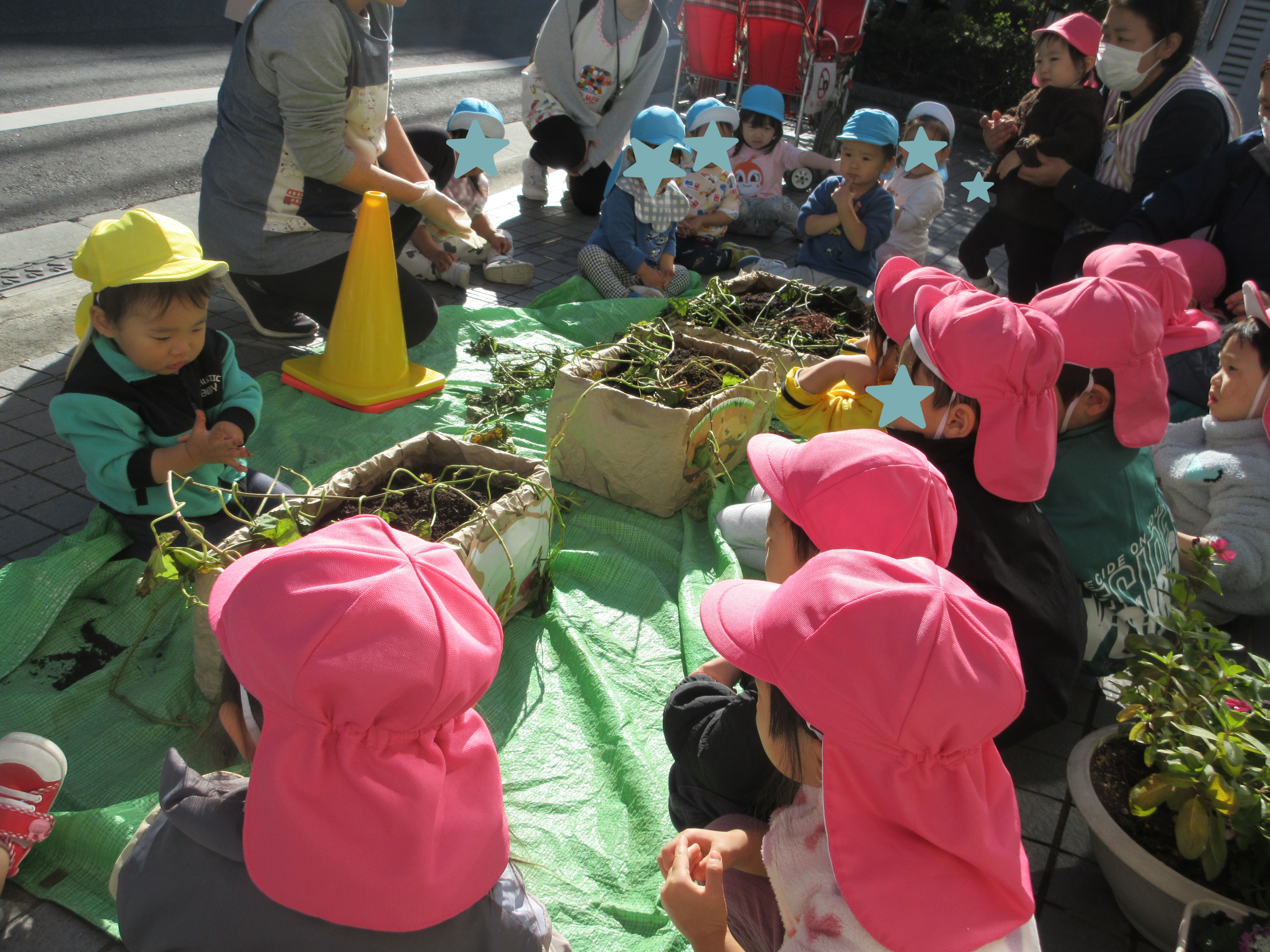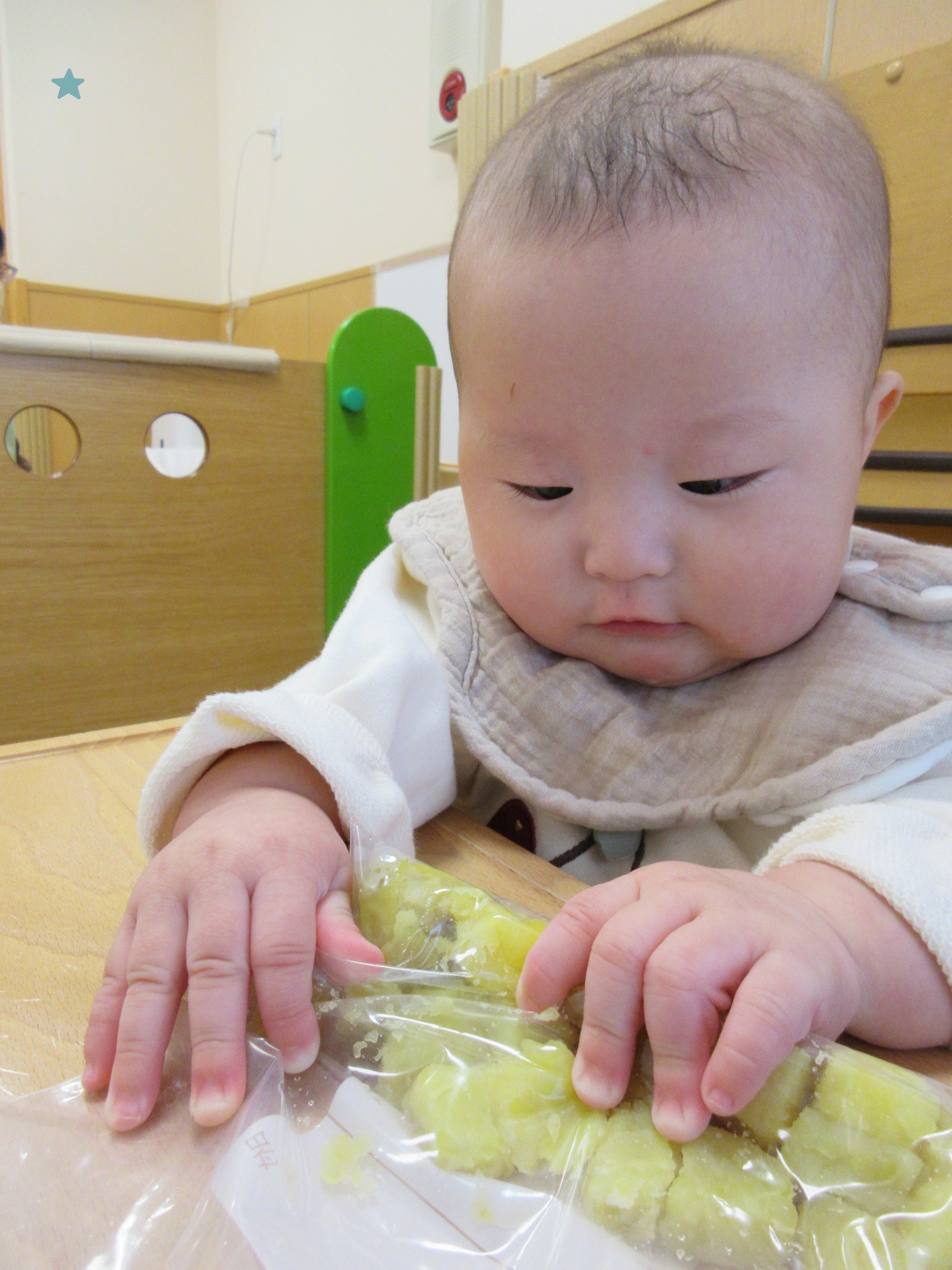 0~1歳児クラスは、袋の中のさつま芋をモミモミ♡