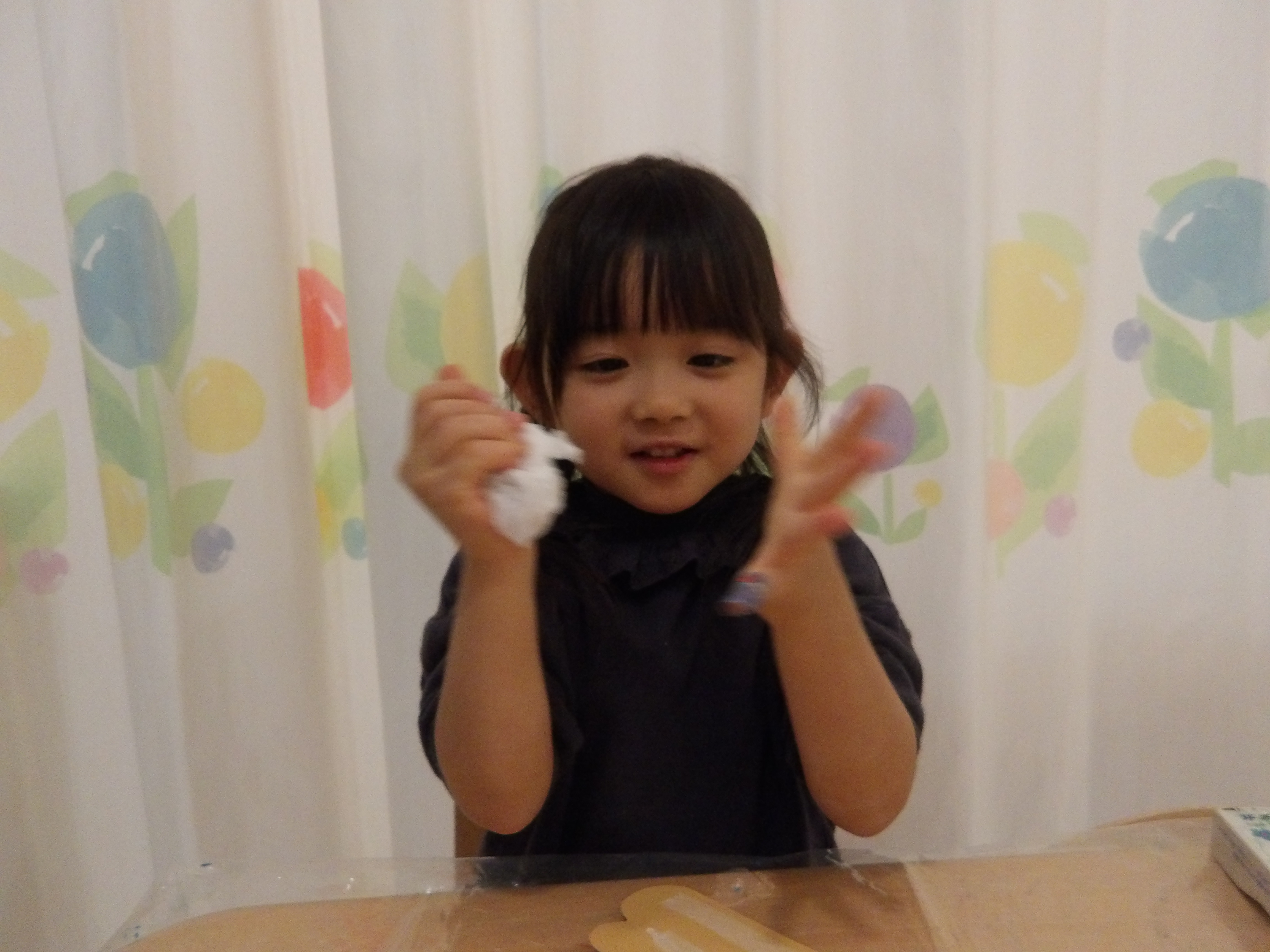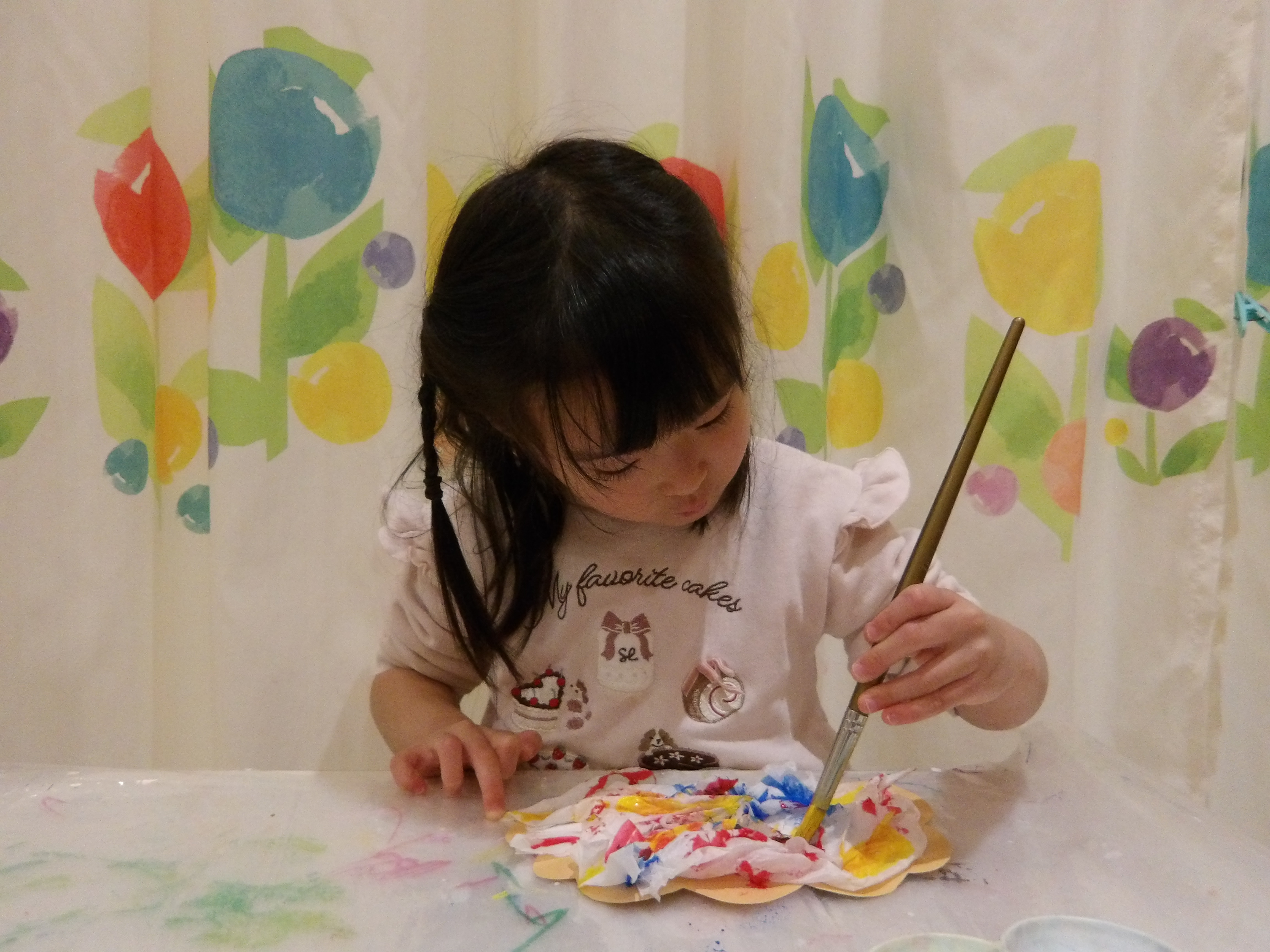 その後、先ほど貼り付けた花紙に絵具で色を付けたり...
