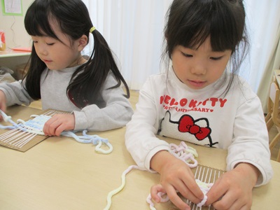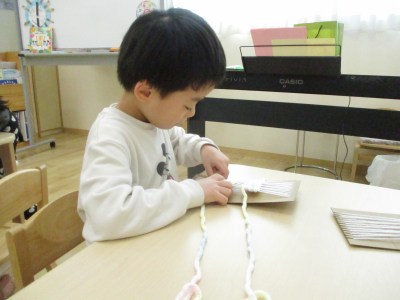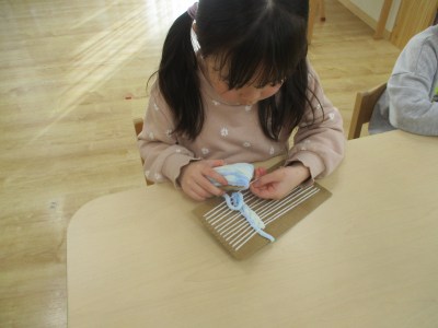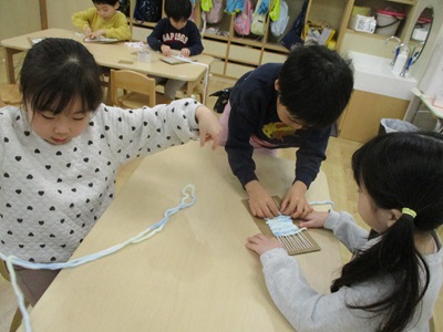 少しずつ慣れてくると自分たちですいすい毛糸を通す子も出てきました。