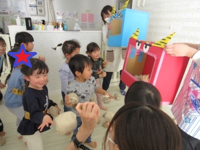 さあ、保育園にやってきた悪いオニに立ち向かいます!!