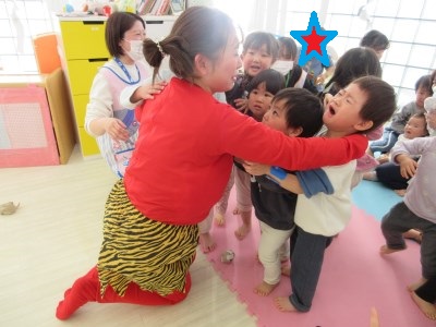 先ほど頑張っているみんなのおじゃま虫をたくさんした園長先生は、オニにされちゃっていたのでした。。。