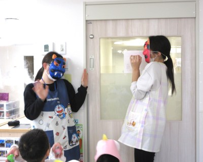 2歳児クラス。子鬼を見つけて、「おには~そと」と元気に豆(新聞紙)を投げていました。
