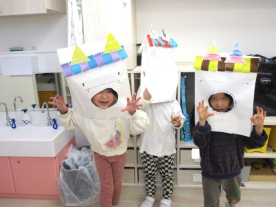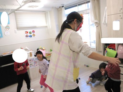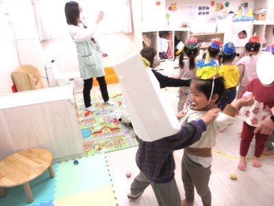 おこりんぼ鬼や、泣き虫鬼などが出てきて、みんなで「おには~そと」の掛け声をすると、かわいい動物さんの姿に戻りました。みんな楽しみながら見ていましたよ♪