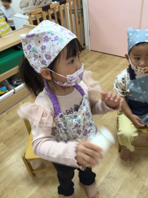 生クリームを瓶に入れて、交代しながら振っていきます。