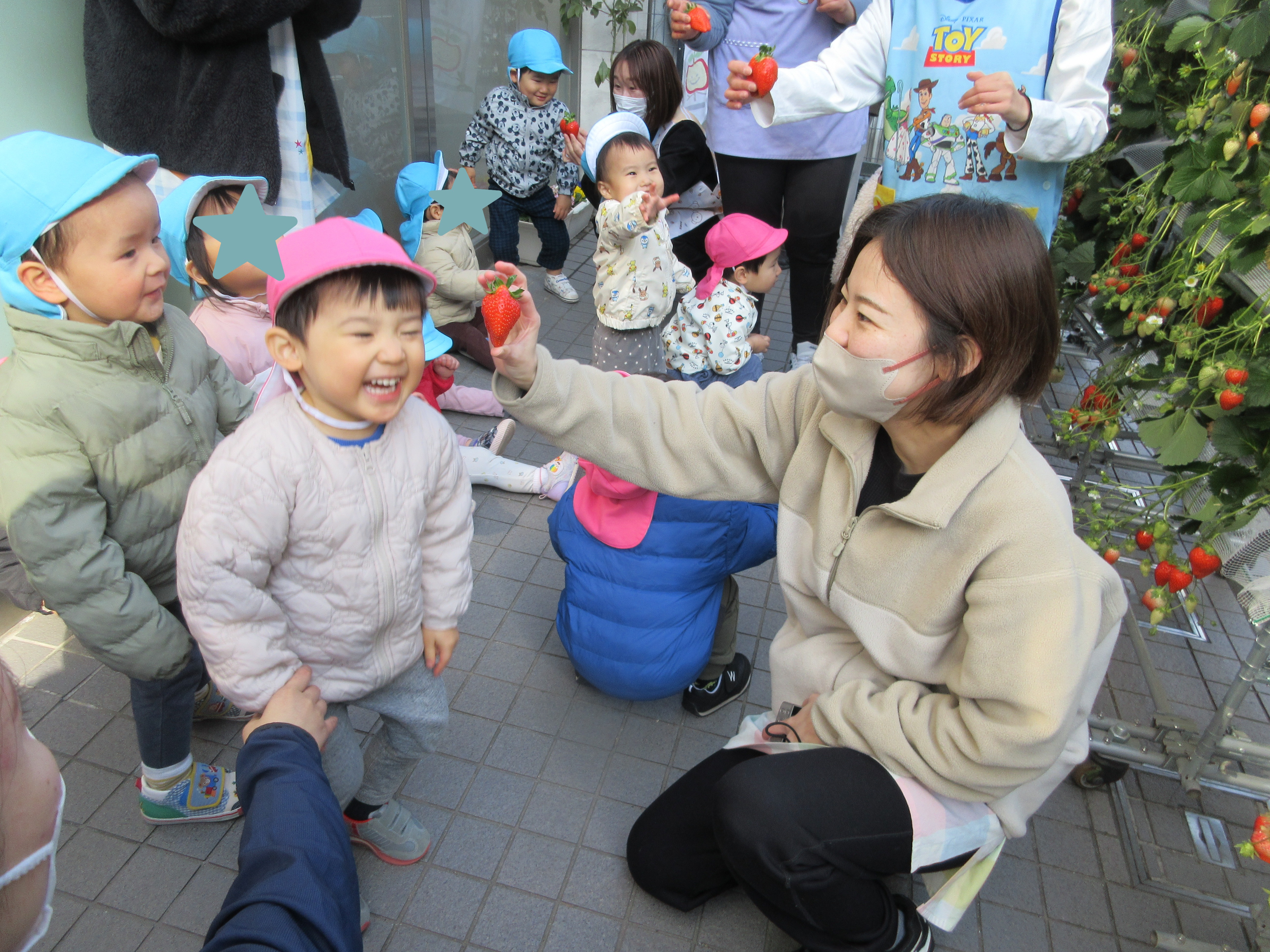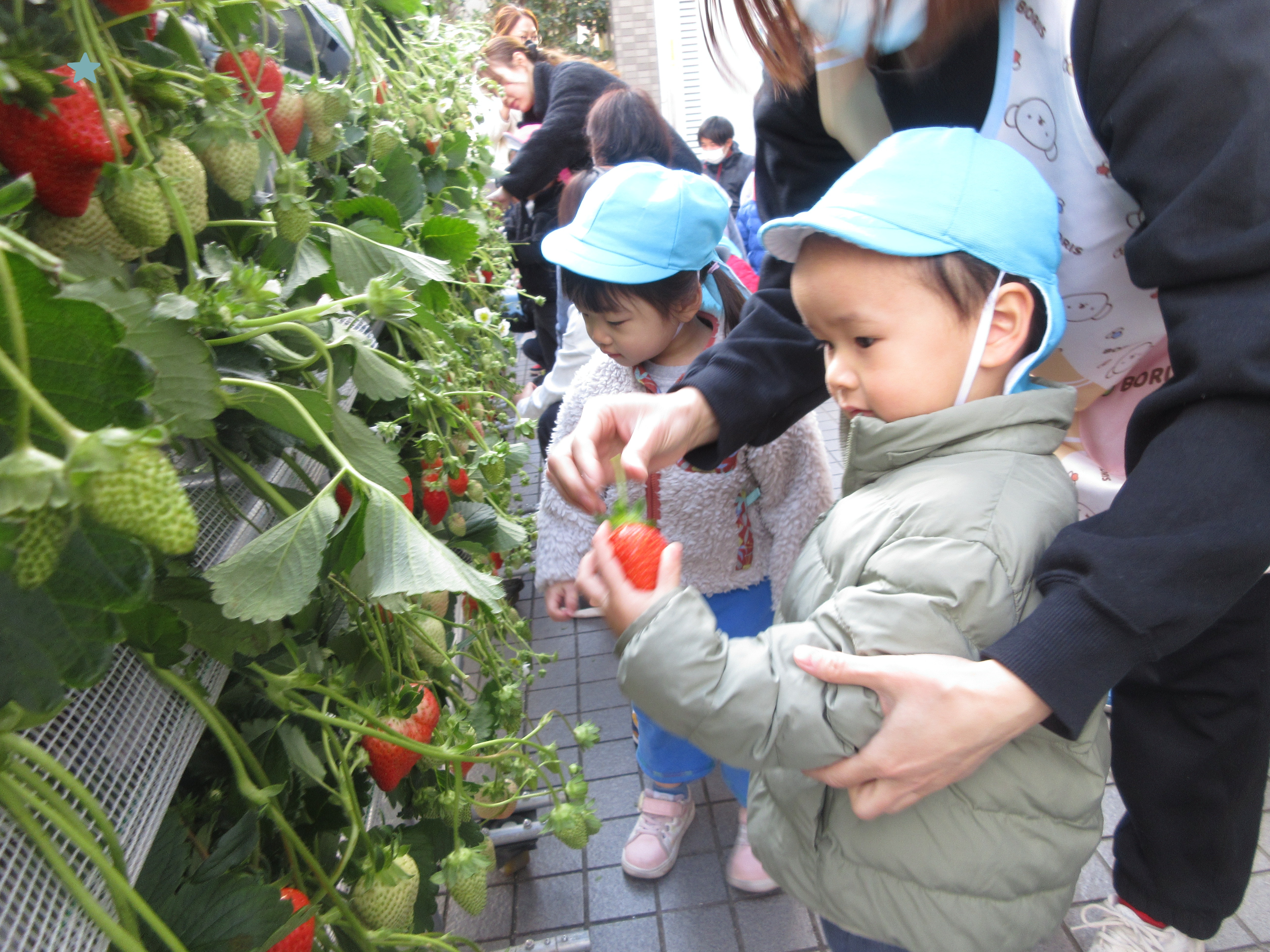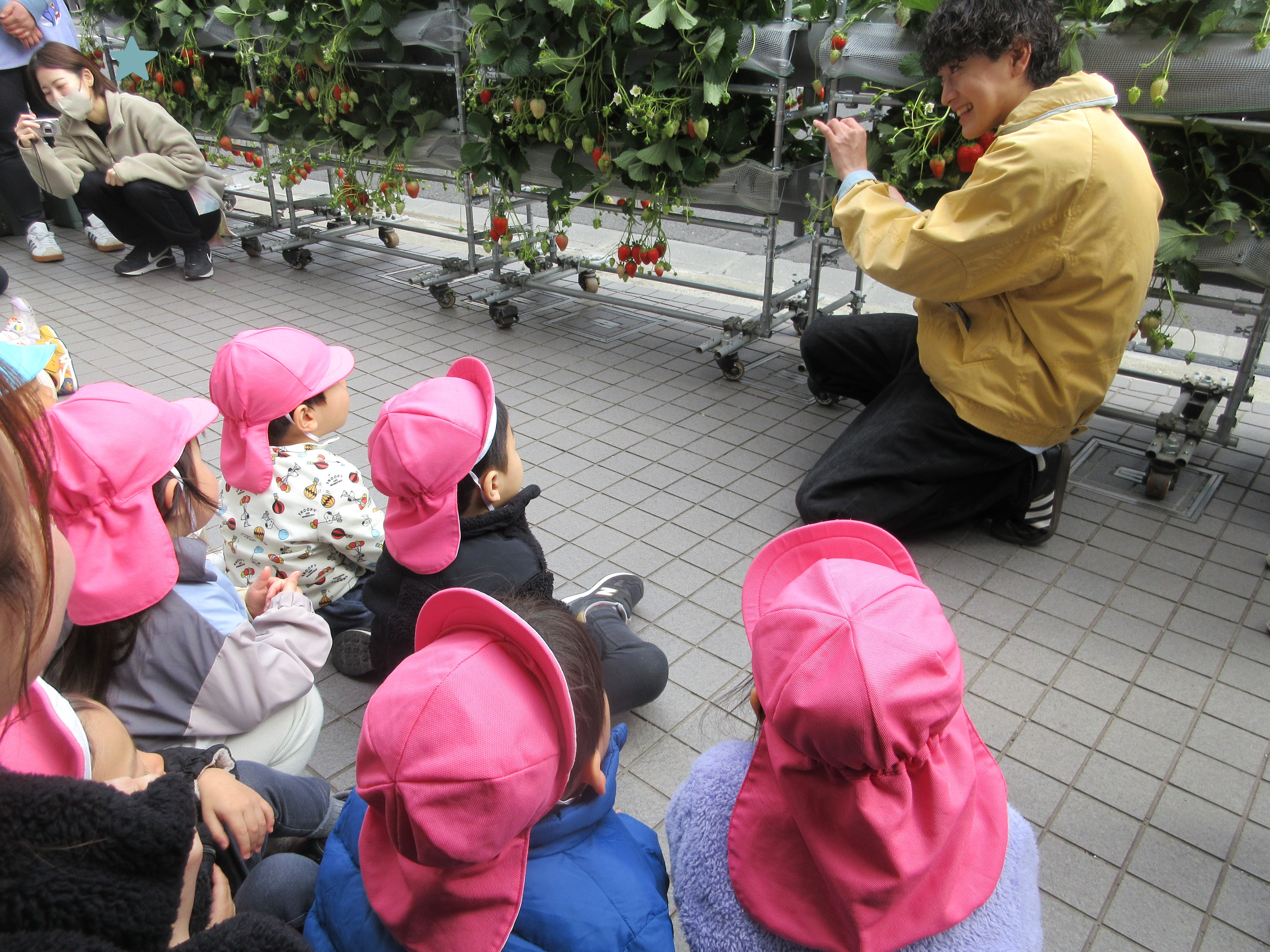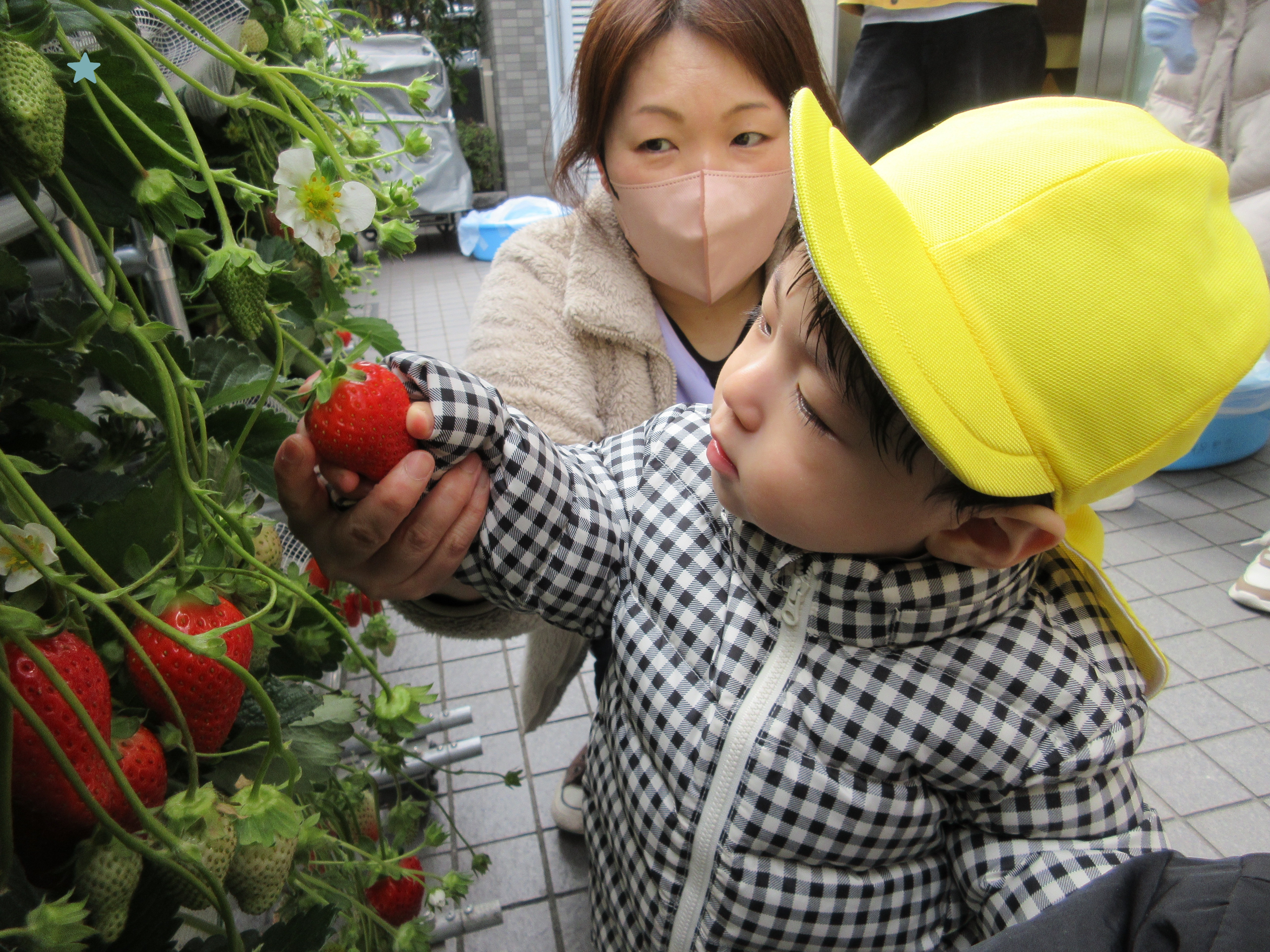 お目目キラキラで講師さんに、上手ないちごの摘み方を教わりました☆