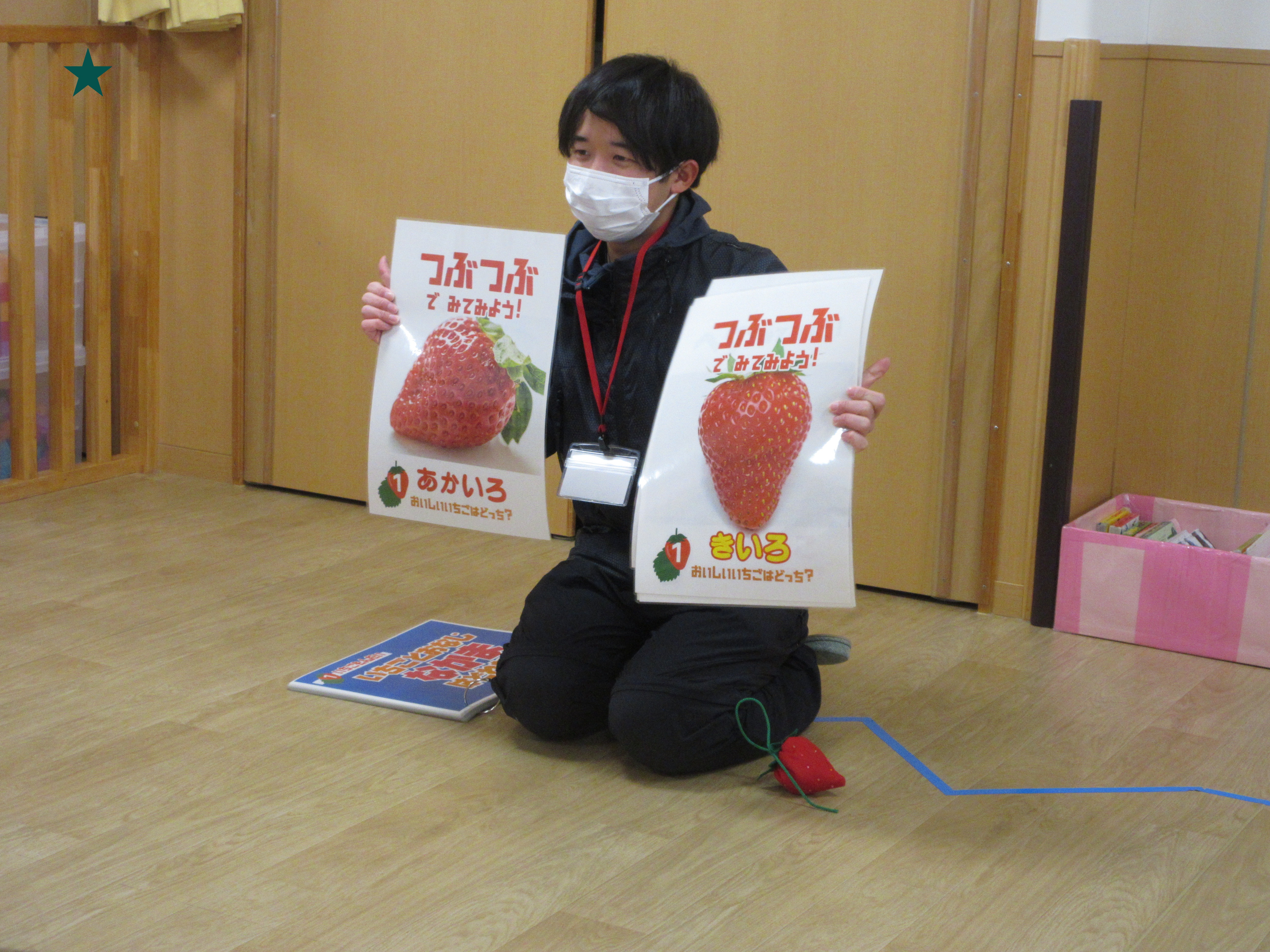移動果樹園の講師さんに、いちごについてのお話しやクイズを