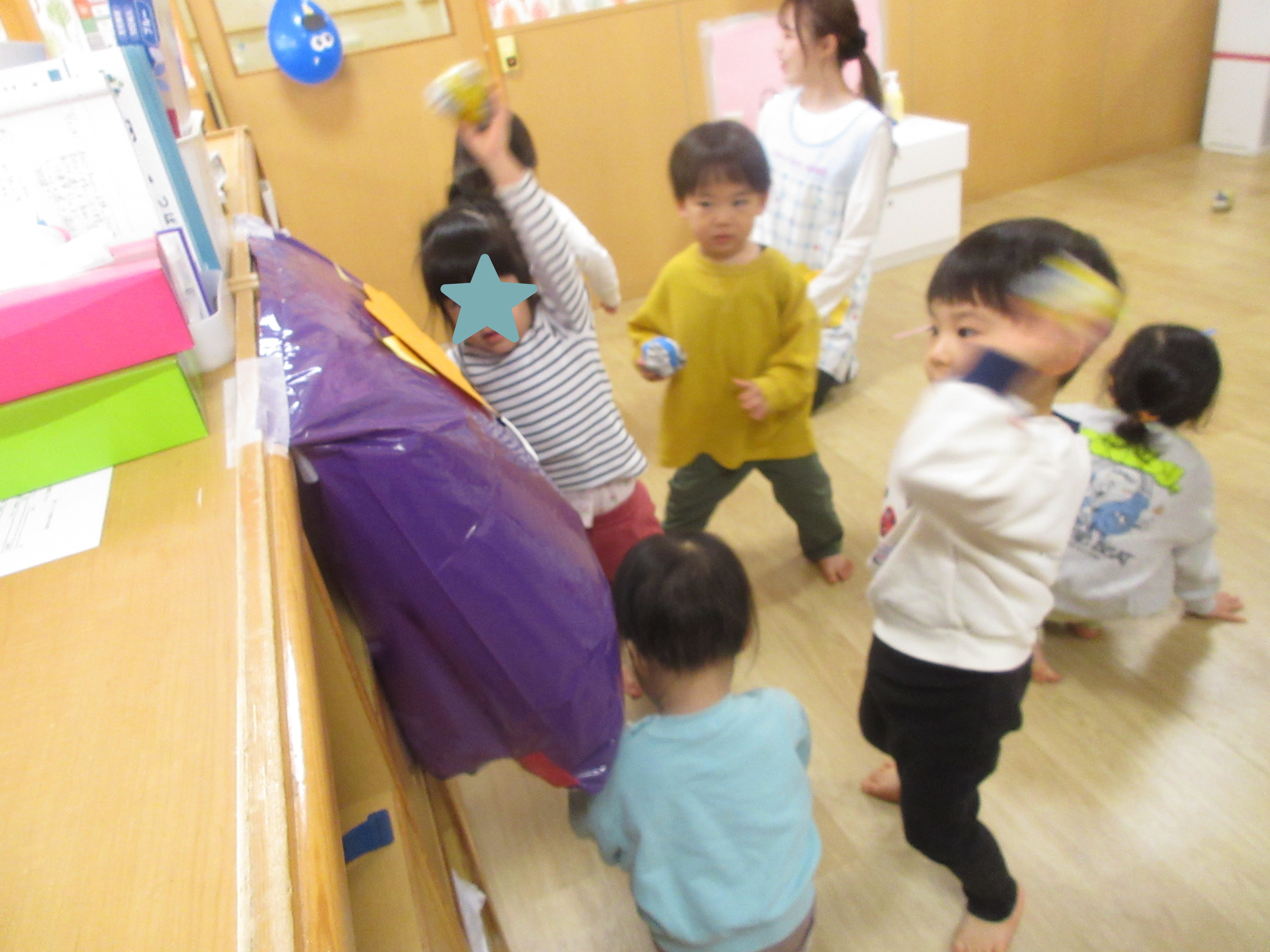 保育者の後ろに隠れながらも頑張って投げる子☆