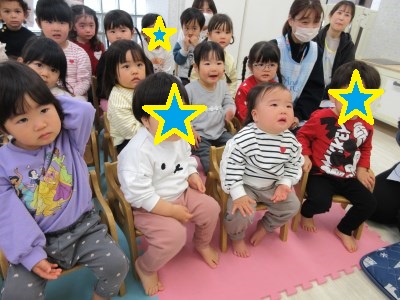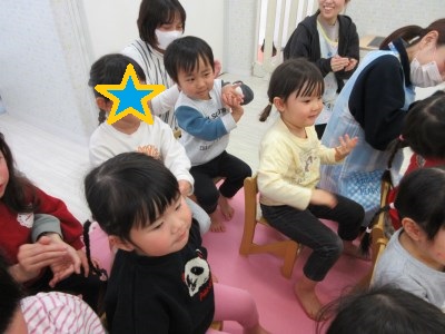 2月3日の節分の赤鬼さんを思い出したのか…天狗さんを見て固まる子どもたち(笑)それまで笑顔を見せていたお友だちも一瞬で表情が変わっていて「…。」と、なんとも言えない表情が可愛かったです(笑)