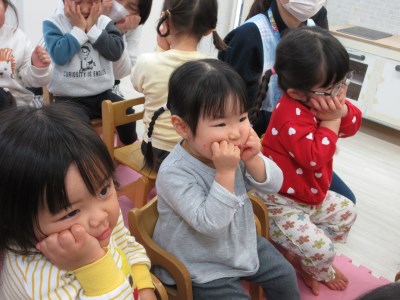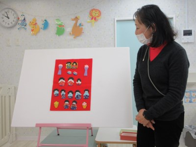 「おひなさまだ!」「ひしもち!」とすぐに気づくきりん組さん、さすがですね!3月3日のひなまつり会に向けてみんなで「ひなまつり」の歌を歌い、今日のお話し会を終えました!