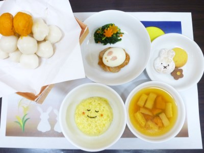 幼児クラスで遠足ごっこを行った際、お弁当箱に給食を詰めて提供しました。