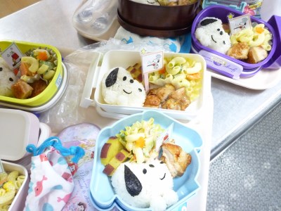 今年のテーマはスヌーピーでした!子どもたちに人気のマカロニサラダやさつまいもの甘煮を入れてみましたよ!