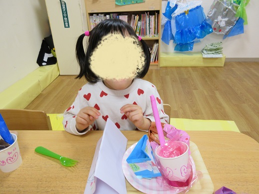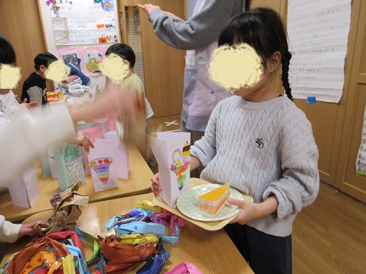 今月のチャレンジ会ではにじ組の子ども達を中心に話し合い作り物をしたケーキ、ドーナツ、ジュース、パフェのお店屋さんを開きました。お店屋さんではチームに分かれて「いらっしゃいませ」と声を掛けたり、お客さん役になってお買い物を楽しんだりしました。