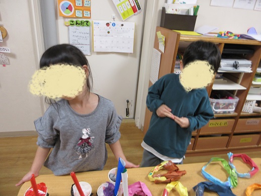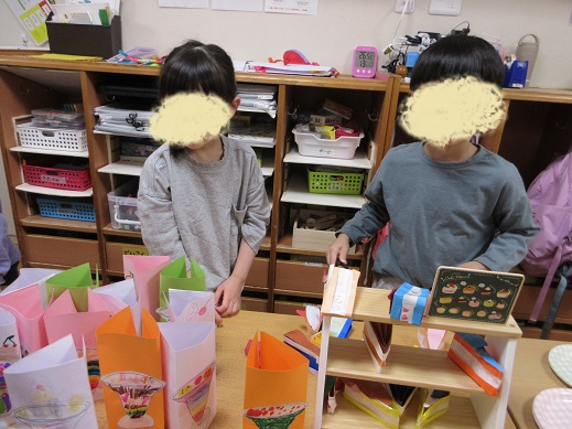 にじ組さんにやり方を聞き、困っているほし組さんには「こうやってやるんだよ」「ここ一緒にやろ」など声を掛けるそら組さん。楽しくお話をしながら店員役もお客さん役も楽しみました!途中「らっしゃいませー」とお魚屋さんのような元気な声も聞こえてきました。