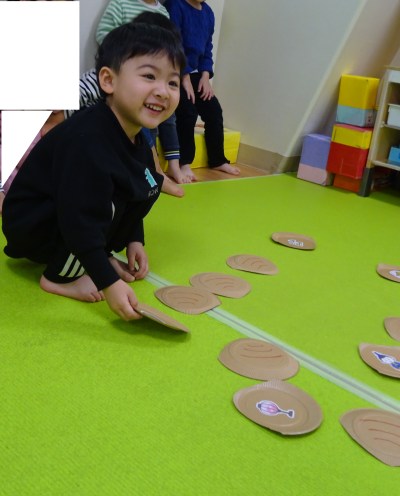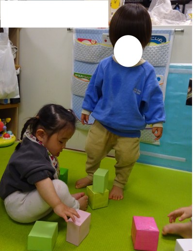 ゲーム遊びは、0歳児さんは、菱餅積みの挑戦です。