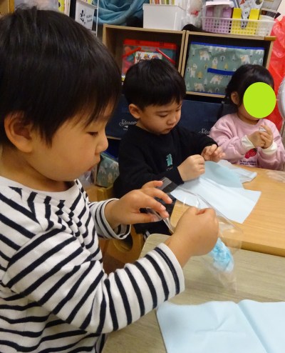 おはながみをクシュクシュしたりビリビリして、ビニールに入れ、