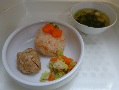 ちらし寿司、つくねハンバーグ、キャベツのゆかり和え、麩のすまし汁