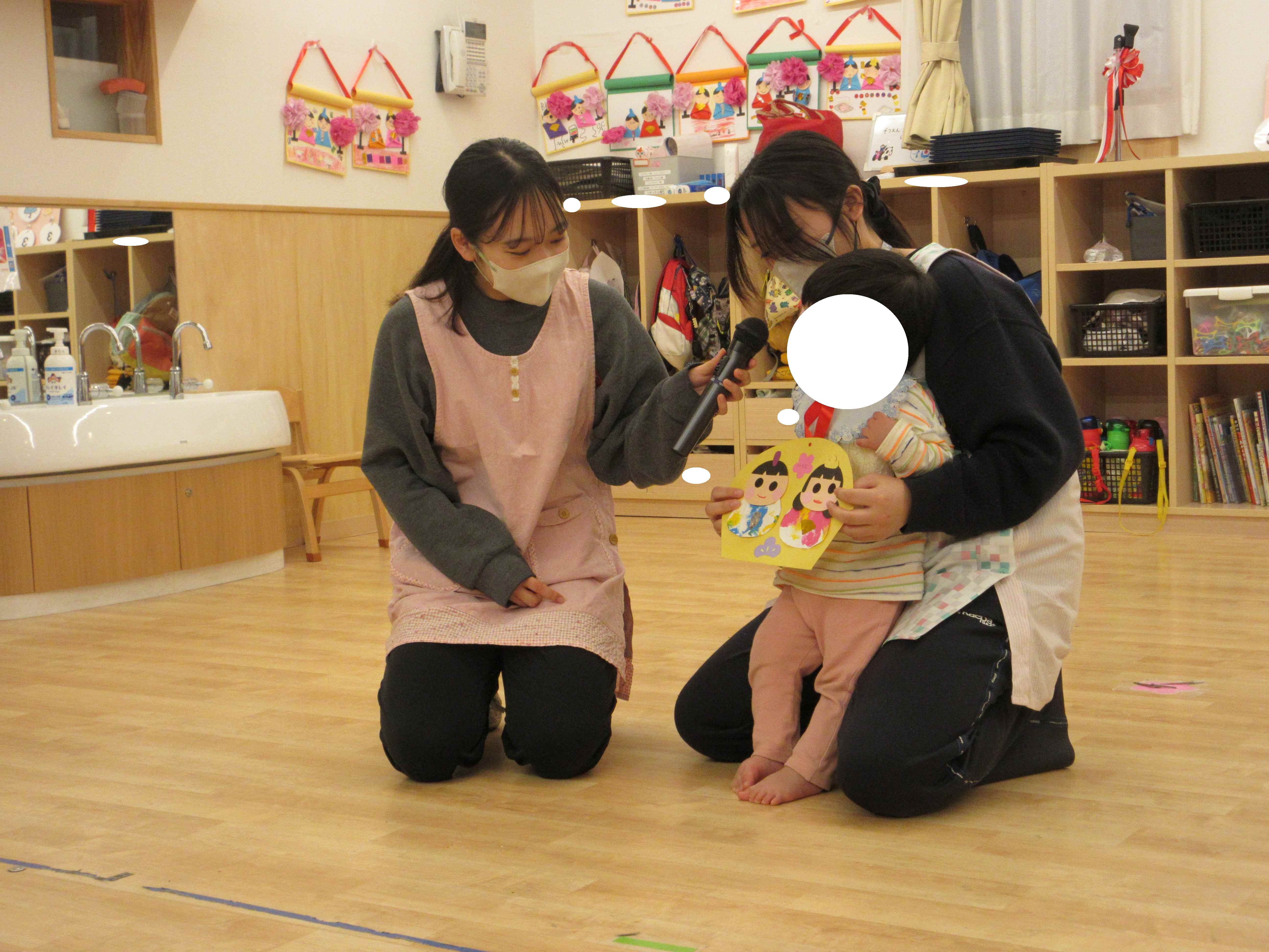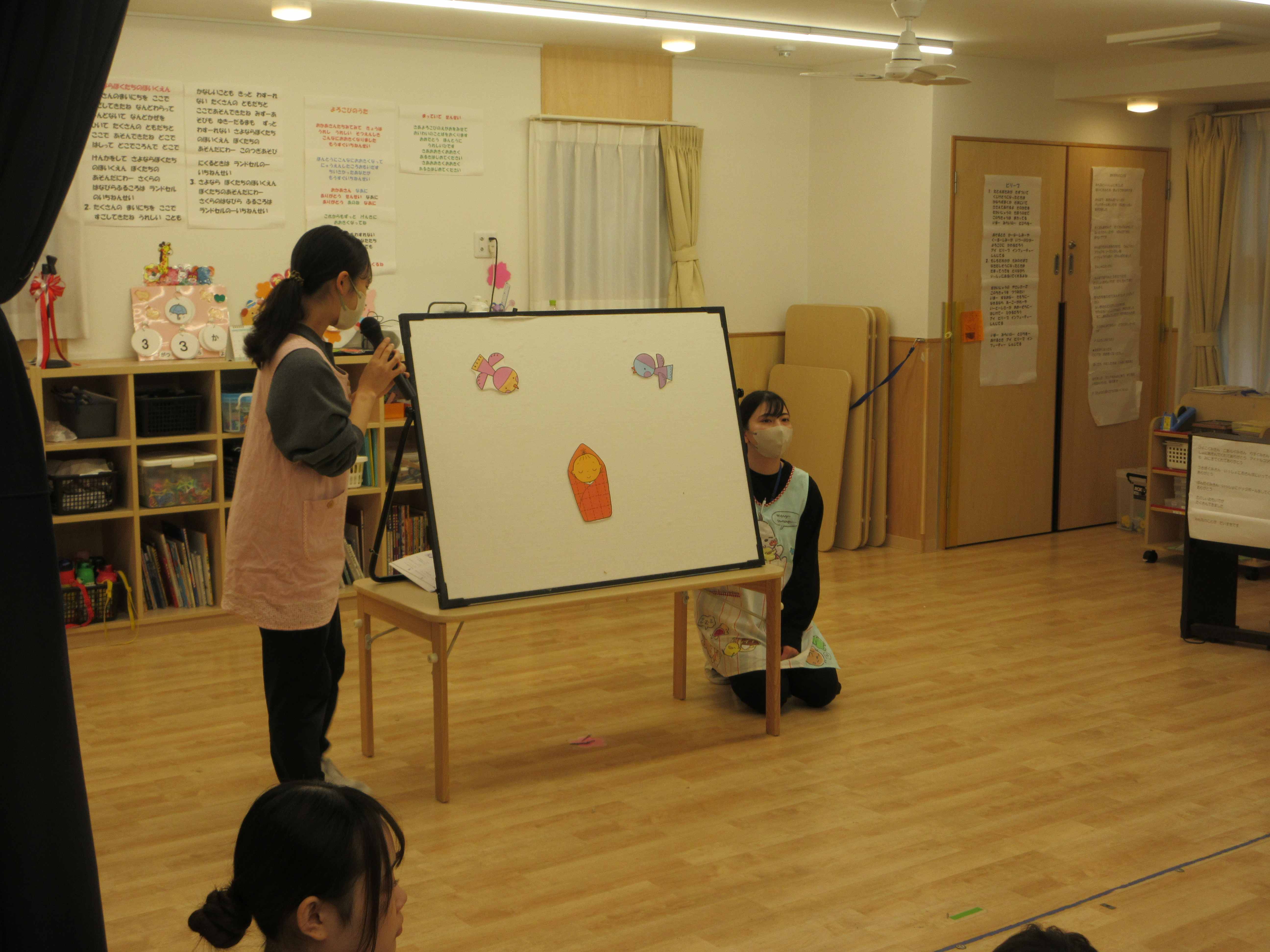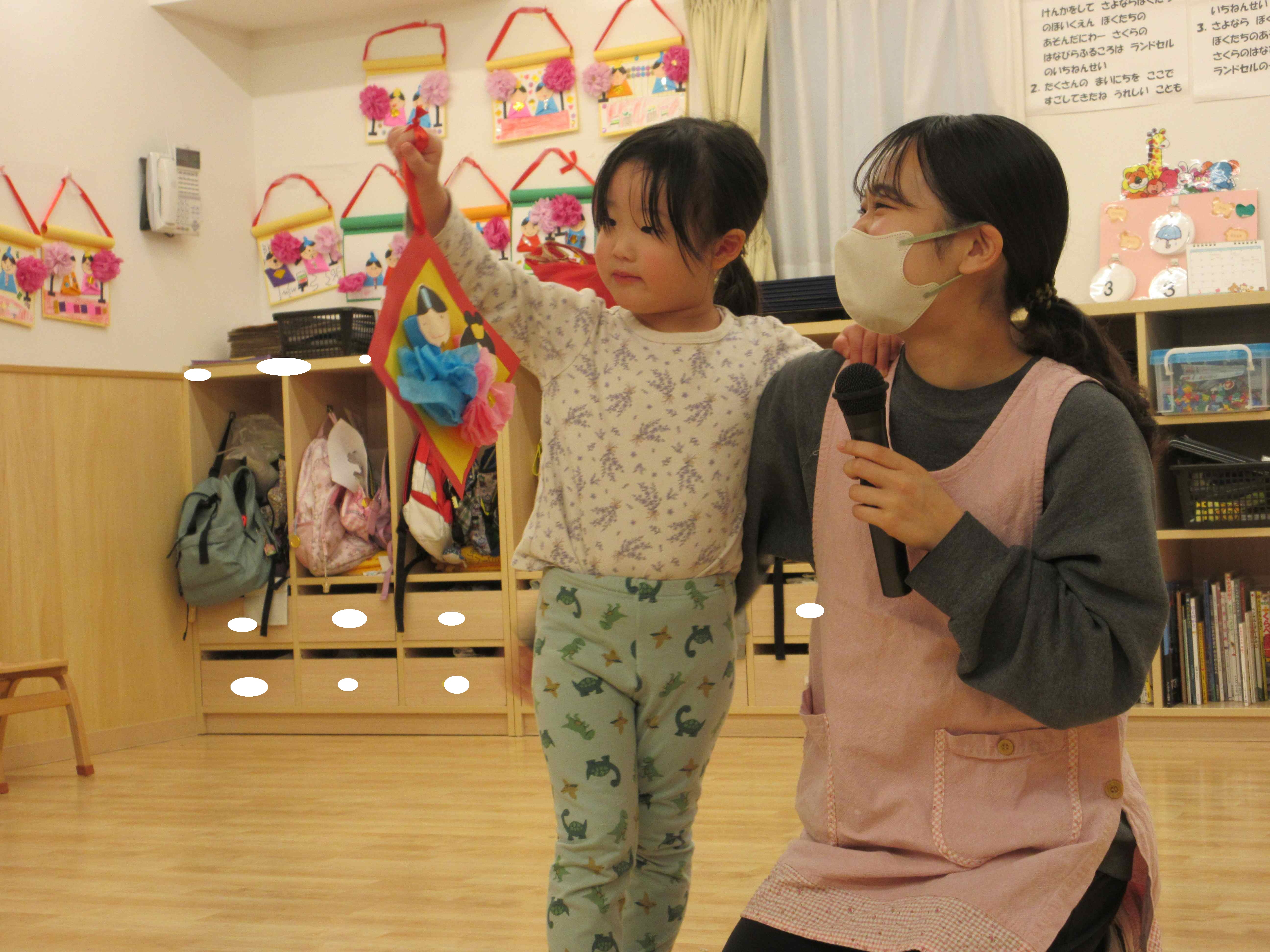 まずはみんなでひな祭りに関するパネルシアターを見て、ひな祭りの歌を歌いました。