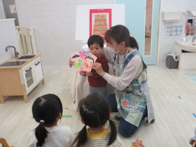 ひよこ組さんは指で画用紙に絵の具をぬり、着物の模様を付けました(^^)目のシールも自分たちで付けて、いろいろな表情の可愛い飾りができました♡