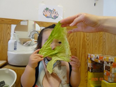 大きな春キャベツが届いたので0歳児のお友だちにちぎってもらいました!