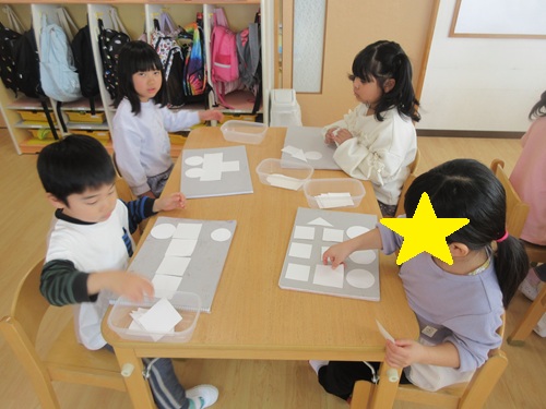 丸、三角、四角の形を使って自分の身近にあるものを考えて見立てました。