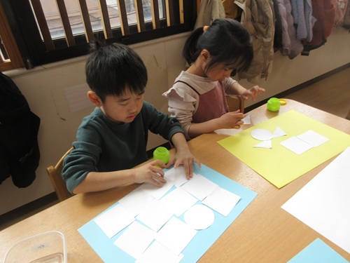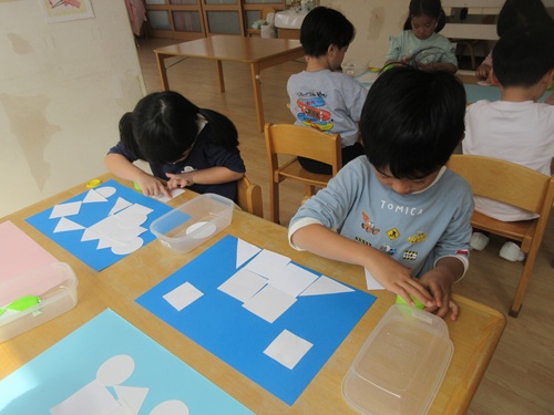 形が決まると画用紙の色を選び、バランスを考えながら糊で貼っていました。