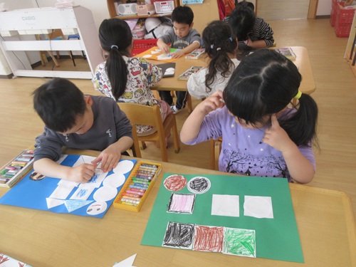 最後にクレヨンで色を塗り、イメージしたものに見えるように工夫して描く姿が見られました。