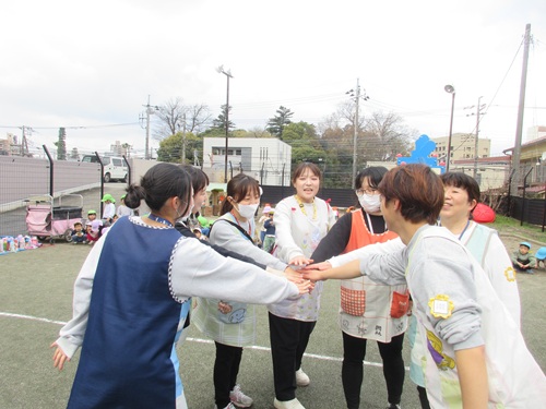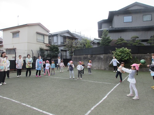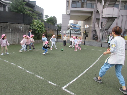 最後は、にじ組vs職員でドッジボールを行いました。試合前には、円陣を組んで気合を入れました。他のクラスの子どもたちも応援し、とても盛り上がりました。