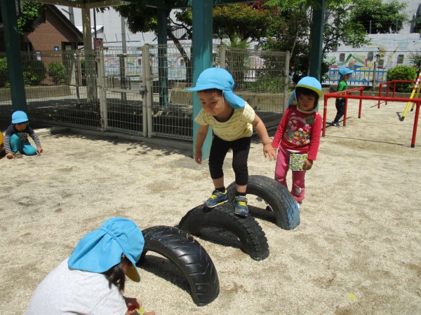 タイヤ跳び、上手にバランスをとっています!