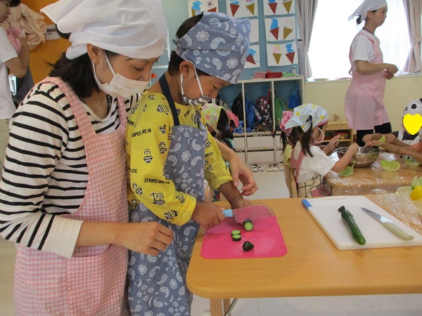 きりん組さんは給食の先生に教えてもらいながらキュウリを切りました。