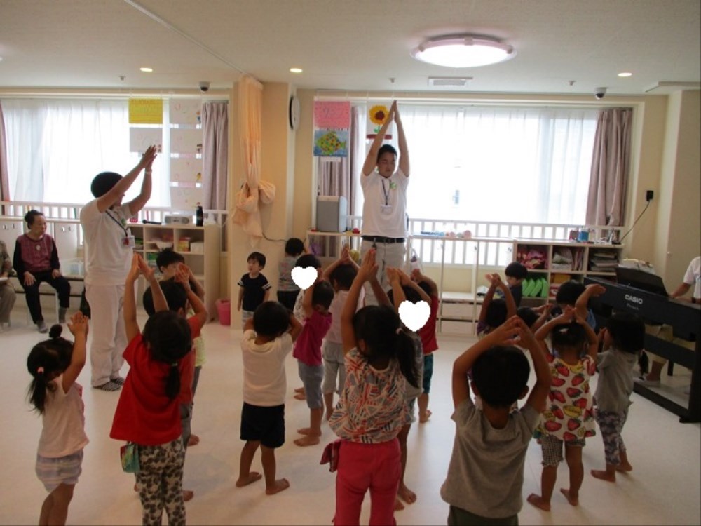 朝の挨拶をして、「幸せなら手をたたこう」を元気に歌いました。