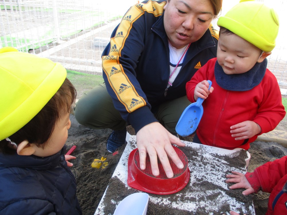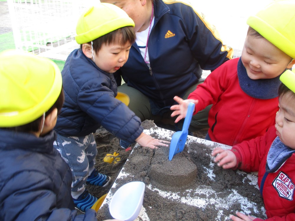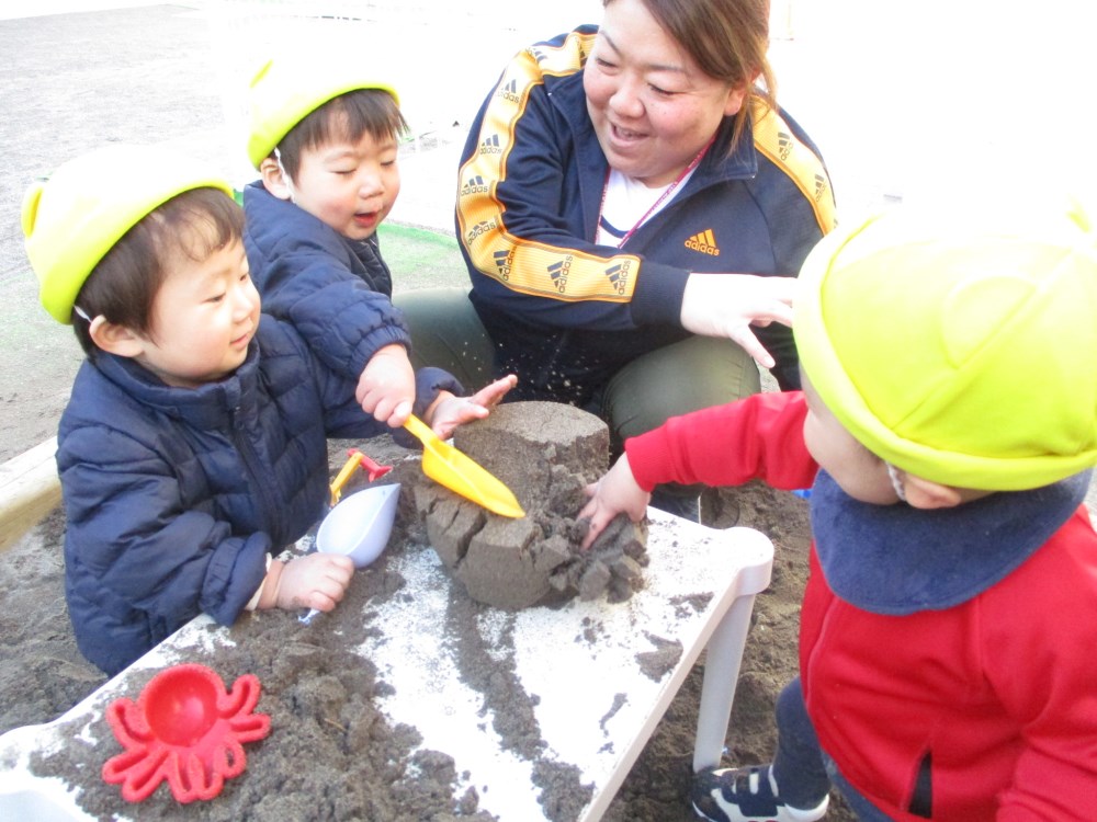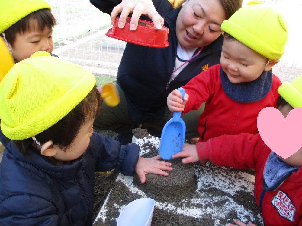 こんにちは 日生曳舟駅前保育園ひびきです ひよこさんが園庭で遊んだ時の様子をお伝えします 砂場で先生が砂のケーキを作ってくれると・・・ とってもいい笑顔♡ 嬉しそうに遊んでいました!! 寒さなんて関係ない!! 元気いっぱい遊んだひよこさんでした♡